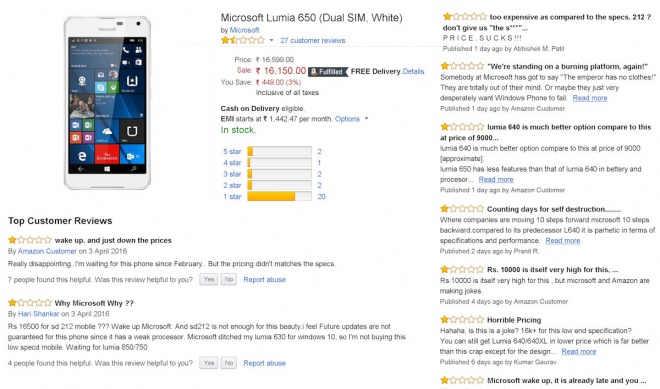 Devido a isto, muitos usuários estão deixando comentários negativos em varejistas locais exigindo que a Microsoft reduza o preço de venda do Lumia 650, alegando que ele deveria se enquadrar no máximo na faixa dos US$ 180 caso a companhia de fato quisesse que alguém se interessasse em adquiri-lo no país. Para se ter uma ideia, a pontuação média atingida por ele na Amazon da Índia é de apenas 1,5 estrela, demonstrando que o mercado está rejeitando fortemente o preço praticado pela casa de Redmond.