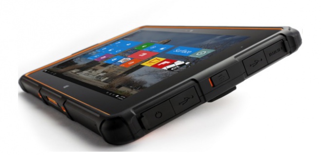 Por trás dessa cara de bravo existe um tablet com Windows 10, tela de 8 polegadas, sensor de temperatura, identificação por digitais, entrada HDMI, wi-fi, internet móvel 4G, proteção contra água e duas câmeras, frontal e traseira.