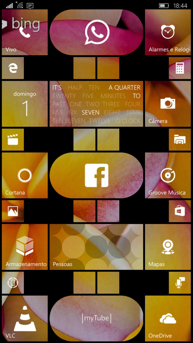 Quem pensou que toda tela inicial do Windows Phone seria igual, mudando apenas o papel de parede, está muito enganado. O leitor Eduardo Santiago mostrou que o sistema Windows 10 Mobile da Microsoft permite pensar fora do quadrado. Para isso, ele usou o aplicativo Circle Tile Pack para criar as tiles arredondadas, e o app Transparent Tiles para criar os blocos em branco. A imagem de fundo foi tirada do banco de imagens do Bing, focando em algo mais da natureza, mas apostando em cores vibrantes que devem ganhar vida em smartphones com tela AMOLED.
