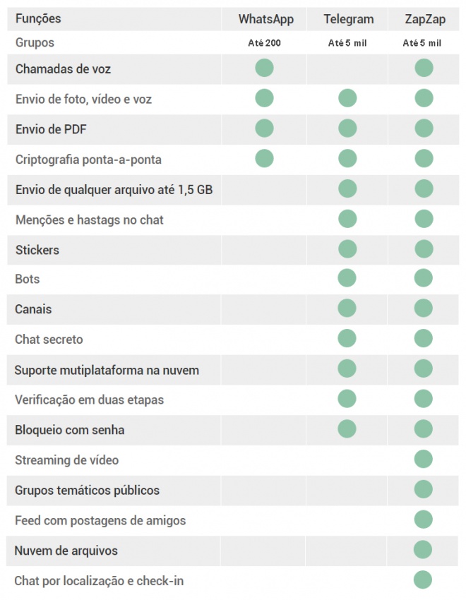 Mas, por fora, correm outras opções, como o app brasileiro ZapZap. Desenvolvido a partir do código-fonte do Telegram, o mensageiro traz ainda mais funções que o WhatsApp e, surpreendentemente, supera até o seu "irmão russo". Por mais que não seja tão popular, vale a pena conferir o que pode torná-lo mais atrativo, ao menos em termo recursos, do que seus rivais.