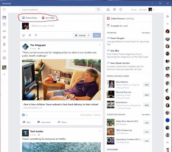 O foco dessa atualização parece ser a transmissão de videos ao vivo, já que o botão "live video" foi realocado em posição de destaque. Com a função se popularizando, o Facebook considera importante lhe dar maior visibilidade. Se você acha estranho essa mudança sendo que se trata do aplicativo para PC, devemos lembrar que a loja de apps dos tablets é a mesma utilizada nos desktops. Isso leva a acreditar que a intenção do Facebook é incentivar o "live video" principalmente em aparelhos como Surface.