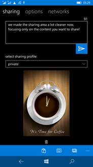 A versão básica do aplicativo permite que o usuário compartilhe atualizações como imagens ou textos no Facebook, Twitter e LinkedIn, mas é possível atualizar para a versão PRO, que "desbloqueia" ainda mais redes sociais como: Tumblr e Geeklist, além de permitir a sincronização de múltiplas contas do Twitter e páginas do Facebook.
