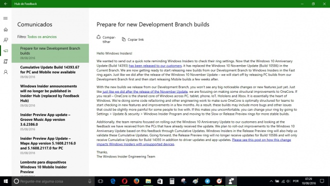 "Quisemos enviar uma nota rápida lembrando Insiders do Windows de verificar seus ajustes do ciclo de desenvolvimento. Agora que a Atualização de Aniversário do Windows 10 (Build 14393) foi liberada para os nossos clientes, ela substituiu o Update de Novembro do Windows 10 (Build 10586) no ramo atual. Nós agora estamos nos preparando para começar a lançar novas versões do nosso ramo de Desenvolvimento para Insiders do Windows no ciclo rápido novamente. Assim como fizemos após o lançamento do Updade de Novembro do Windows 10, vamos começar a liberar builds para PC em nosso ramo de desenvolvimento em primeiro lugar e, em seguida, começar a liberar builds Mobile algumas semanas depois."