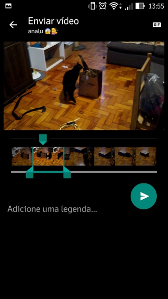 Assim que o total selecionado tiver o máximo de seis segundos, será possível tocar em um botão na parte superior direita da tela (onde há um ícone de câmera, indicando que a seleção é um vídeo). Ao tocar nesse ícone, ele mudará para a palavra GIF, indicando que a seleção agora é uma animação. Basta enviar para o contato e ver que as cenas são exibidas diretamente na tela da conversa, e não em um espaço à parte, como o vídeo.
