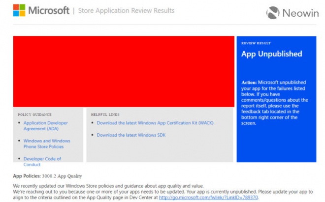 A empresa ressalta que o motivo que os aplicativos inéditos foram afetados, é a falta de cumprimento com as seguintes políticas de qualidade da Windows Store: