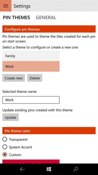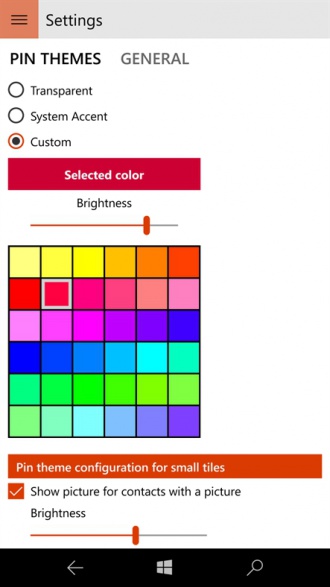 As opções de temas permitem escolher a aparência da Live Tile. Essas opções incluem estilo de tema e cores, configuração para live tile pequena e outra para live tiles médias. Já as opções de configuração trata da exibição dos nomes de contatos, números de telefone, fotos e texto customizado.