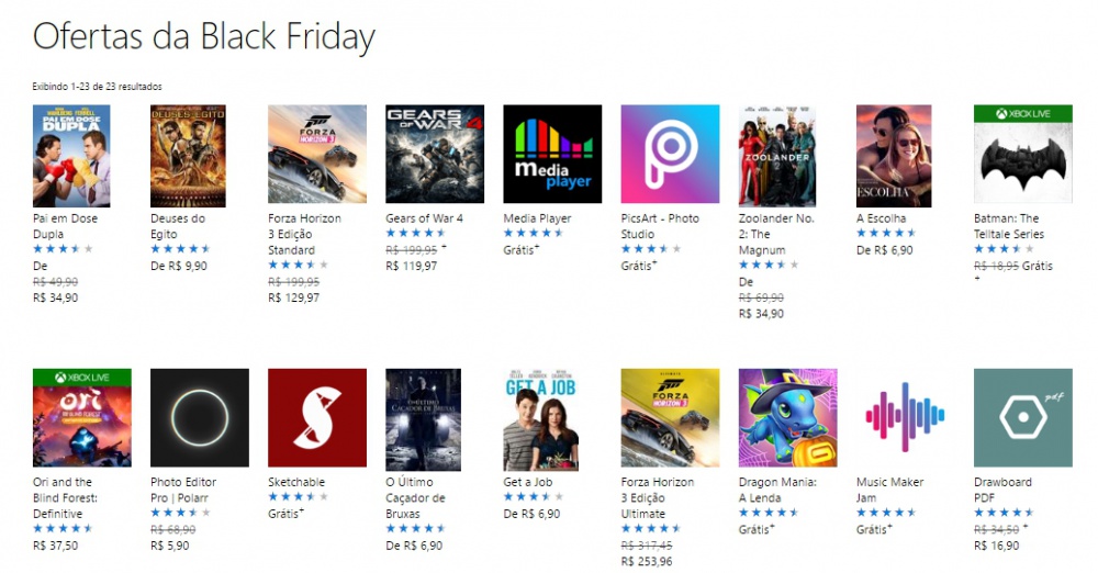 A Black Friday também chegou à loja do Windows. A Microsoft começou a exibir uma série de ofertas para compra de aplicativos, jogos e filmes com desconto, além de pacotes de conteúdo extra dentro de apps. Entre os itens em promoção, há ainda dois games de console, para jogar no Xbox ou Xbox One.